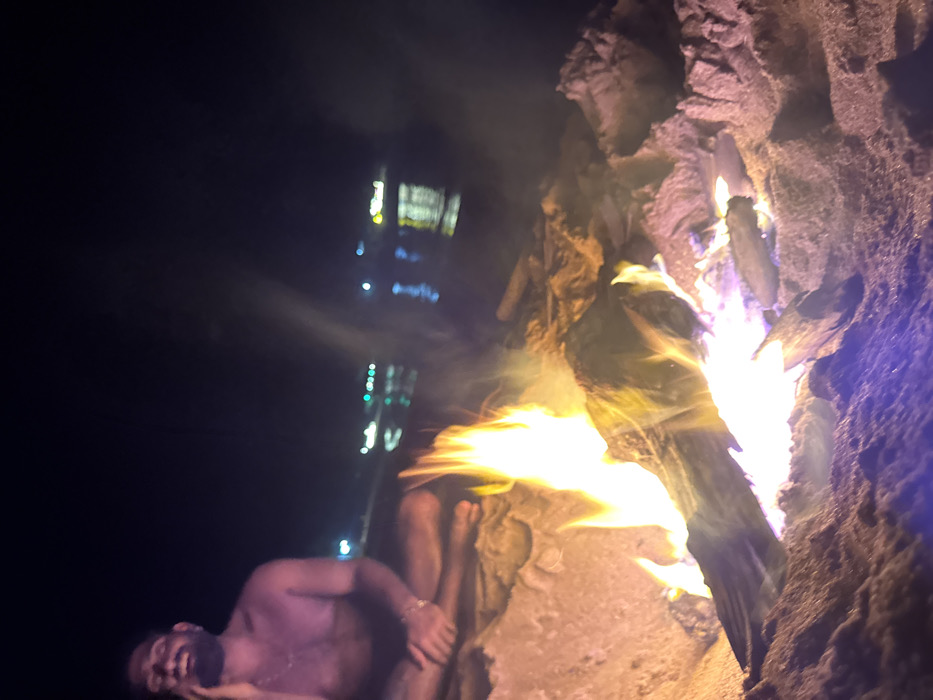 In a dark outdoor setting, a man without a shirt sits near a rock formation with a fire burning on it. The flames are bright yellow and orange. The man is laughing and holding his face. In the background, blurred lights from a tall building are visible. The rock formation is textured and has a rough appearance. The scene is dimly lit, with the fire providing the primary source of illumination.