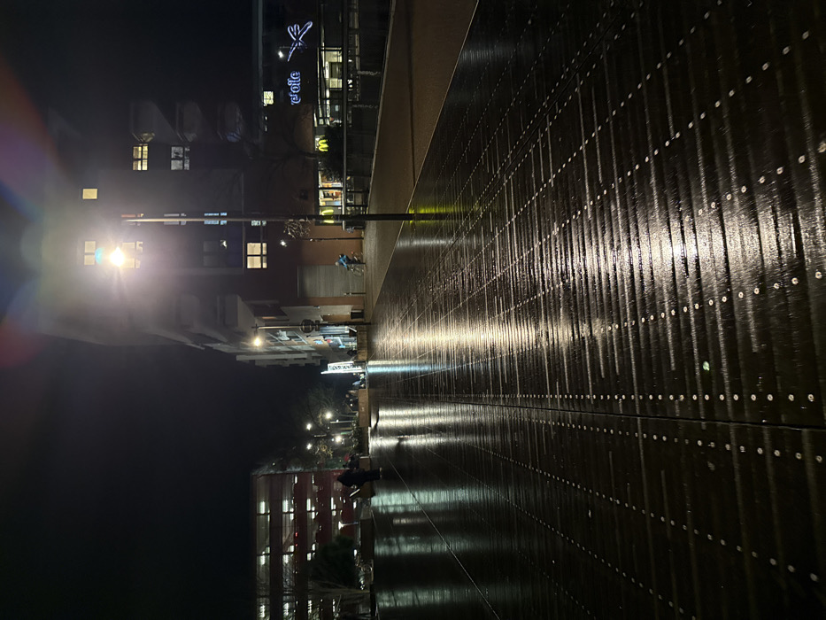 Night view captures a building lined with illuminated windows and a McDonald's sign. Adjacent is a wet surface reflecting lights, creating elongated streaks. Further down the path, more buildings are visible under streetlights. A figure is seated on the lower part of the image.