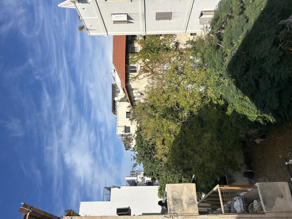 This image depicts an elevated view of a residential area in Tel Aviv, Israel, under a clear blue sky with scattered cirrus clouds