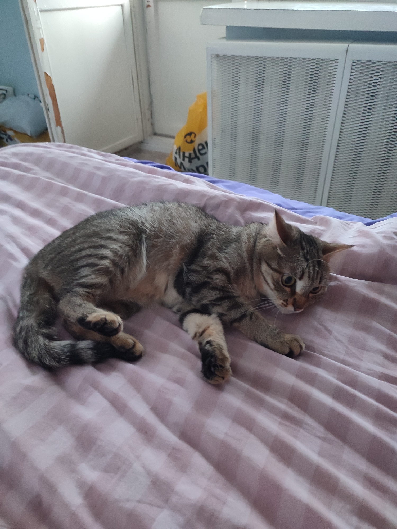 A tabby cat is resting on a pink and white striped bedspread. In the background, there is a radiator and a partially visible yellow shopping bag. The location is Chaikovsky, Russia.