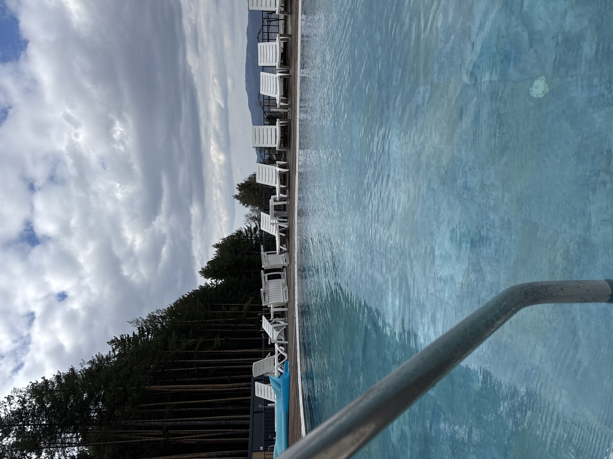 The image depicts an outdoor swimming pool facility in Sapareva Banya, Bulgaria. A metallic grab rail, partially submerged, occupies the lower-left foreground of the blue-tiled swimming pool, which exhibits surface ripples and an underwater drain. On the wooden deck surrounding the pool, multiple white plastic loungers are positioned; some are upright, others partially folded or stacked. A small white plastic table is also visible. A blue, partially deflated inflatable raft rests on the deck near a dark, rectangular structure on the left. No individuals are present in the scene. The left background features a dense, tall coniferous forest. The distant background on the right reveals a panoramic landscape of hills or mountains, partially obscured by a railing. The sky is predominantly overcast with grey and white clouds, with limited areas of lighter blue visible.