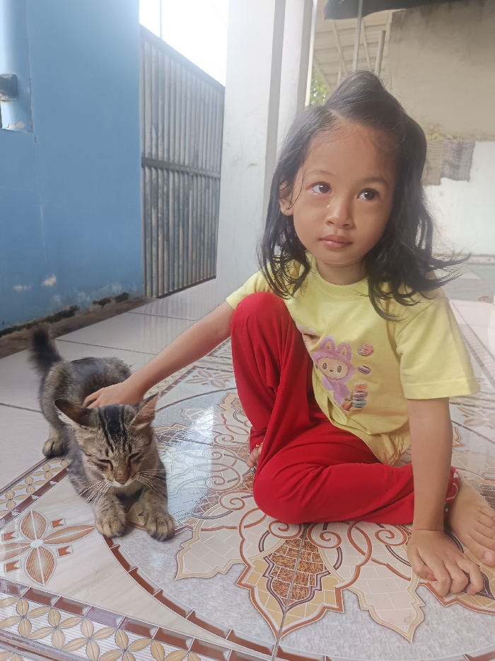 - "A young girl in a yellow t-shirt and red pants sits on a tiled floor, with a brown tabby cat standing beside her" by FM-WRTkH2, licensed under CC BY 4.0