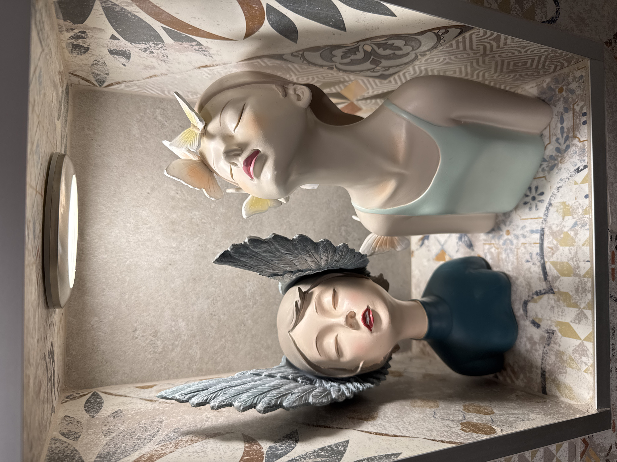 Two sculptures of young girls with their eyes closed are displayed in a recessed shelf unit