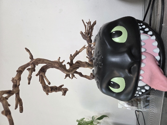 A black, character-themed planter, resembling the head of Toothless from "How to Train Your Dragon," is centered in the frame