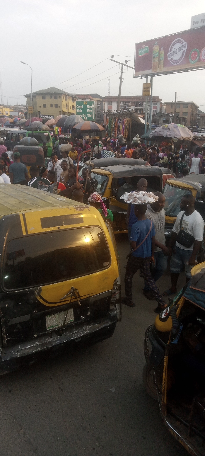 - "The image depicts a congested urban street scene in Onitsha, Nigeria, identifiable by a green road sign indicating "A6" and distances to "Owerri 84km", "Ihiola 37km", and "Nnewi Jnt 10km"" by FM-ieeu82, licensed under CC BY 4.0