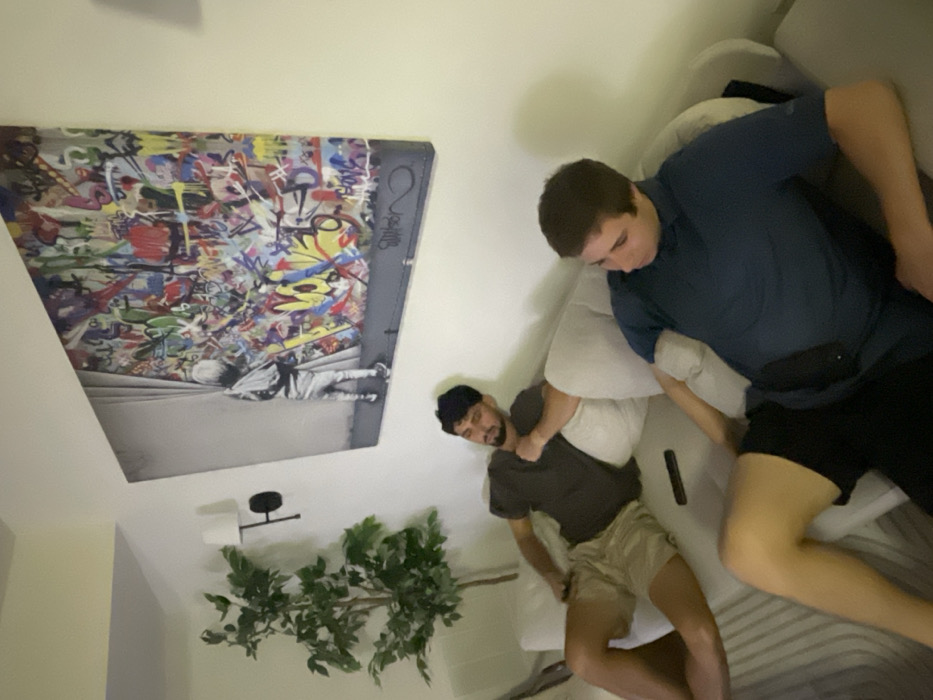 The image captures an indoor living space in Arlington, United States. Two adult males are observed relaxing on light-colored sofas. The male on the left is semi-reclined, wearing a dark short-sleeved shirt and light-colored shorts, holding a dark remote control in his left hand, with his eyes appearing closed. The male on the right is seated, wearing a dark blue collared shirt and dark shorts, looking towards the right, out of frame. A second dark remote control is positioned on the sofa cushion between the two individuals. The background features a large, rectangular canvas print on a light-colored wall, depicting a black-and-white image of a child pulling back a curtain to reveal a vibrant, multi-colored graffiti-style wall. To the left of the artwork, a tall green leafy houseplant is situated in a corner, and a black wall-mounted sconce with a white lampshade is affixed to the wall.