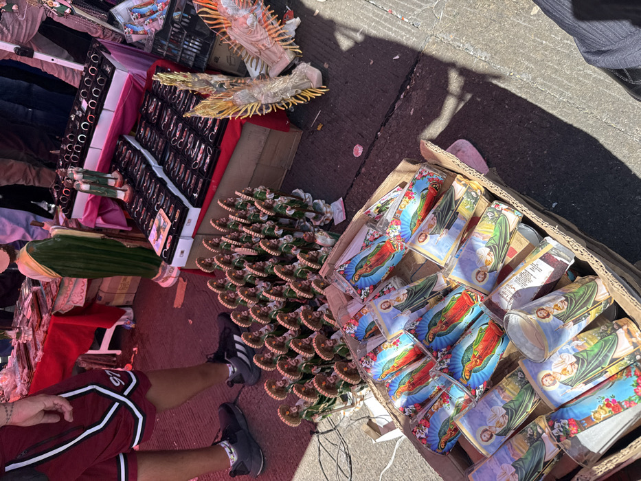 This image depicts an outdoor street market stall in Mexico City, Mexico, likely near a prominent religious site such as the San Hipólito Church, known for its veneration of Saint Jude Thaddeus