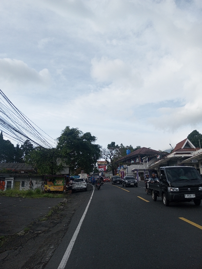 A street scene with light traffic on a cloudy day. A black Suzuki Carry pickup truck drives in the foreground. Other cars and motorcycles occupy the road. Buildings are visible on both sides, including one with a large "JOTUN" sign. Power lines dominate the left side of the frame. A food stall sits on the roadside.