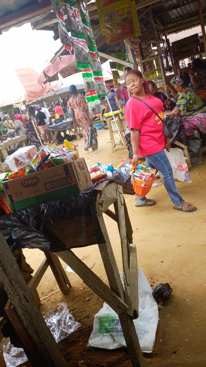 The image depicts a bustling outdoor market in Unknown, Unknown. The ground consists of unpaved earth. In the mid-ground, a Black female stands, oriented slightly right but with her head turned sharply left. She wears a red short-sleeved t-shirt, blue denim jeans with embellishments near the ankles, and brown flip-flops. Her right hand holds an orange plastic shopping basket filled with assorted packaged goods. Her facial expression displays wide eyes and slightly raised eyebrows. To the immediate left, in the foreground, is a rudimentary market stall constructed from rough wooden planks, topped with a black plastic sheet. On this stall, a brown cardboard box labeled "ONGA 50 cubes Savour de boeuf" is visible, alongside other packaged items. Below the stall, on the ground, are scattered clear plastic bags and a white woven sack. Overhead, multiple strings of small packaged goods, prominently featuring red, white, and green colors, hang from an unseen support structure. The background is populated by numerous individuals, predominantly women, moving and congregating around various vendor stalls. These stalls are sheltered by a mix of light-colored fabric awnings and corrugated metal roofing.