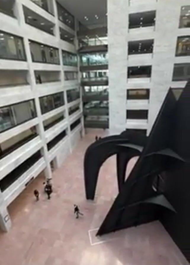 interior of the United States Hart Senate Office Building. A large black sculpture dominates the center of the view. The building's interior structure features multiple levels, each with offices and windows visible. People can be seen walking on the ground floor. The floor is pink, and the building has a skylight at the top, allowing natural light to filter through. The overall impression is of a modern, spacious, and well-lit environment.