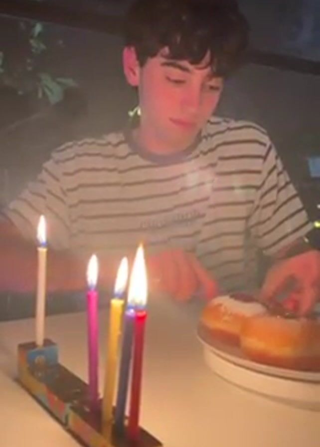 A young man with curly brown hair is sitting at a table indoors. He's wearing a striped t-shirt. In front of him is a colorful Hanukkah menorah with four candles lit, as well as a plate of sufganiyot (jelly donuts) sprinkled with powdered sugar. The man picks up a piece of sufganiyot and takes a bite, looking up and to the side as he eats. The background includes a window with a glimpse of greenery and string lights.