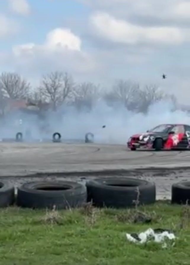 dark-colored car with red and white graphics drifting and spinning in circles, creating a large cloud of white smoke. The car is on a paved track surrounded by grass and tires. In the background, there are bare trees and a building resembling an airport control tower. A crow flies overhead in one shot. The sky is partly cloudy.