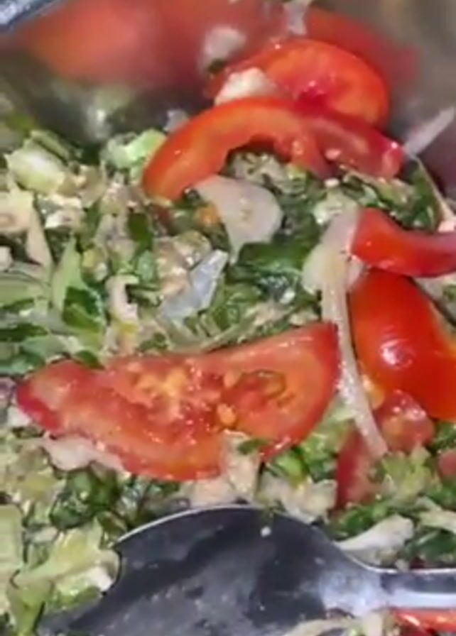 A close-up shot shows a metal bowl containing a mixed salad. Sliced tomatoes are layered on top of chopped green vegetables, possibly lettuce and herbs, with slivers of white onion also visible. A silver spoon rests inside the bowl. The lighting appears dim, casting shadows within the bowl.
