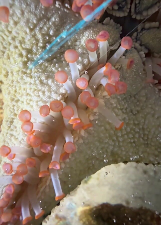 close-up of a sea star in an aquarium. The sea star is beige with numerous white tube feet tipped with a peach-colored, rounded end. A thin, transparent thread is partially visible across the sea star's surface. A bright blue piece of plastic is also visible. Air bubbles are present in the water. Some dark rocks are visible in the lower part of the frame. A voice speaks briefly, in a language other than English.