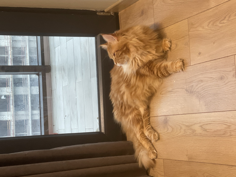 A large, long-haired orange and white feline lies prone on a light-toned wooden floor, positioned near a dark-framed glass door