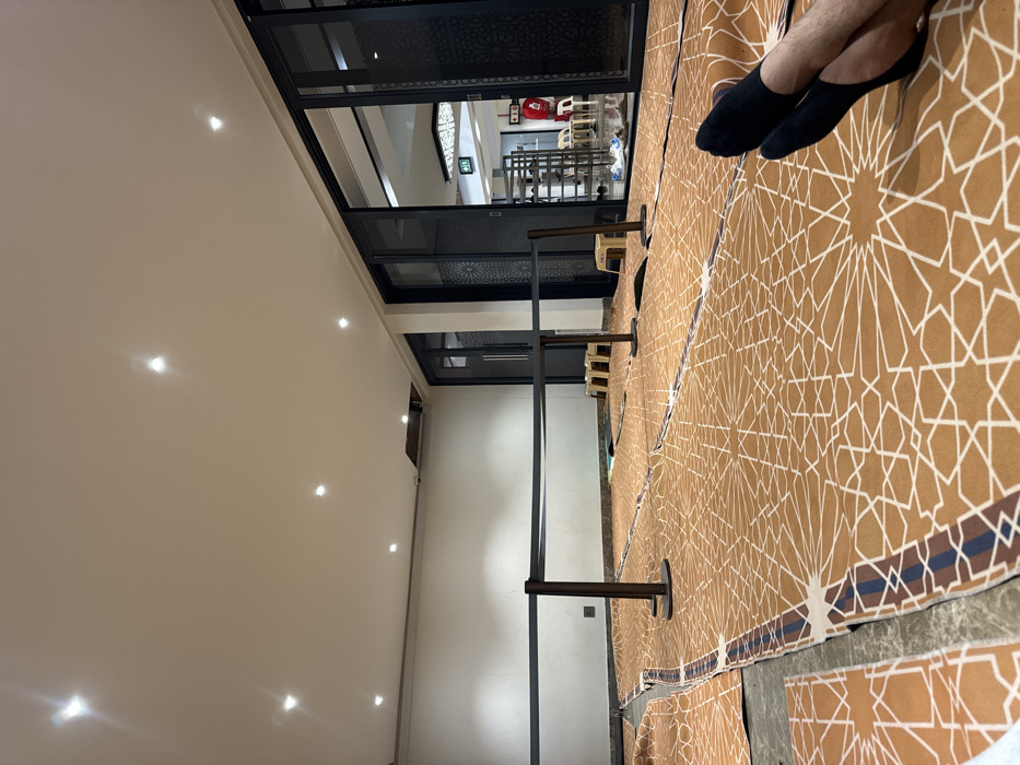 The scene depicts an interior view of a prayer hall, likely within a mosque or Islamic center, located in Durban, South Africa. The room is illuminated by multiple recessed spotlights in a light-colored ceiling, which also features a single missing panel section in the back left corner. The walls are plain and light-colored. The floor is predominantly covered by multiple rectangular prayer rugs featuring an orange-brown background with white geometric star patterns. These rugs are laid out across the floor, some overlapping or showing visible edges, indicating they have been recently unrolled or are not permanently affixed. Approximately midway into the room, two dark-colored stanchions with dark gray retractable straps form a low barrier or divider, stretching across the width of the visible area. Near the far right wall, several small, light-colored wooden stools are visible on the prayer rugs. On the right side of the room, a series of dark-framed sliding glass doors or panels, featuring intricate dark geometric patterns in their lower sections, provide access to an adjacent area. Through the partially open doors, a brightly lit interior space is visible. This adjacent area contains a dark shelving unit, several white plastic chairs, and a red garment or object hanging on a rack. A green and white "EXIT" sign is mounted on a wall in this adjacent room. In the bottom right foreground, the lower legs and feet of an individual are visible, clad in black socks. The person is seated or reclining on one of the prayer rugs, with their feet extended towards the center of the room. No other individuals are visible. The room appears to be prepared for or currently in use as a space for communal prayer.