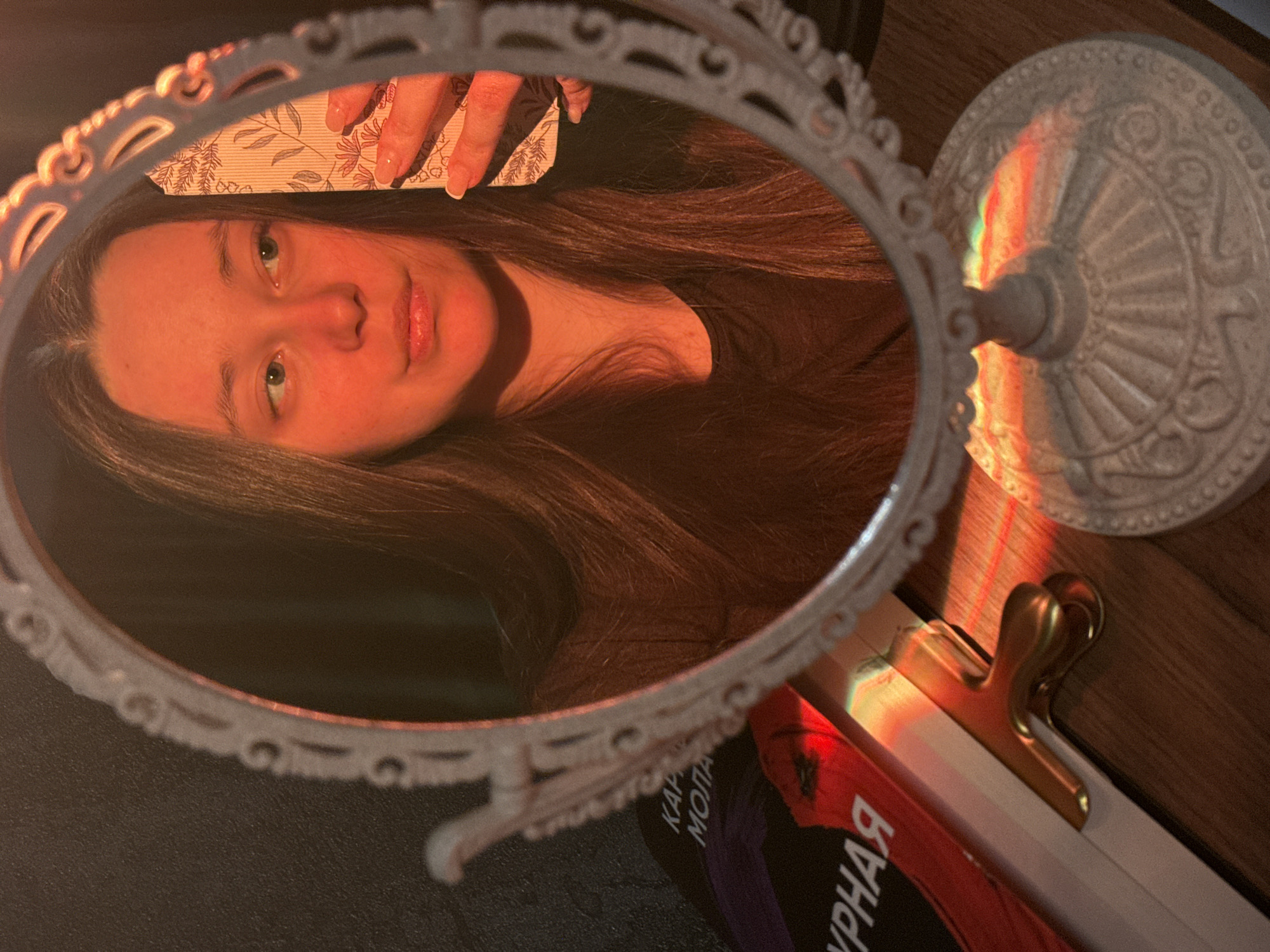 A selfie of a woman is reflected in an ornate, oval-shaped vanity mirror. She holds a cell phone with a patterned case in her hand. She has light skin, brown hair, and light-colored eyes. The light in the room has an orange cast. Next to the mirror's base is a partially visible book with the Russian word "ЧУРНАЯ" (Churnaya) on the spine, and the word "МОЛА" (Mola) above it. Near the book lies a gold-colored clip. A rainbow-colored light is cast on the book, clip, and the base of the mirror. Based on the Russian text on the book, the location is likely in Krasnodar, Russia.