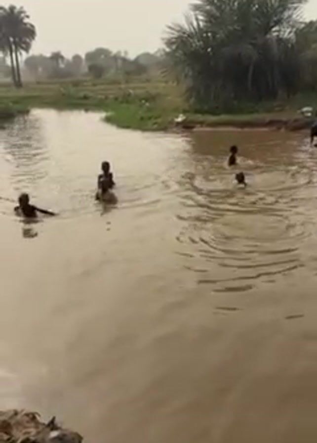 group of children swimming and playing in a murky body of water