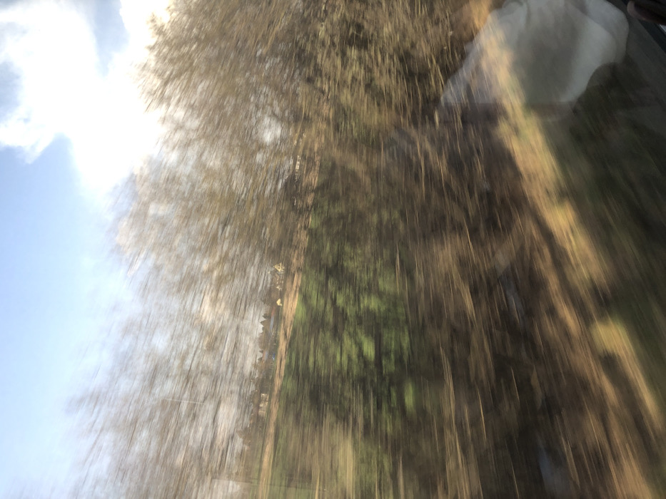 The image presents a highly motion-blurred rural landscape, observed from a rapidly moving perspective, located in the vicinity of Lupstein, France. The upper third of the frame consists of a light blue sky with white, diffuse cloud formations, particularly prominent on the right. Directly below the sky, a horizontal band of dense, bare-branched deciduous trees, indicative of late winter or early spring, is heavily streaked due to motion, dominating the mid-ground. Scattered behind this treeline and within the blurred fields, several indistinct, light-colored buildings with darker roofs are visible, suggesting a distant hamlet or agricultural structures. The foreground features pronounced horizontal streaking of green and brown vegetation, consistent with fields and ground cover adjacent to the observer's path. A bright, indistinct reflection or glare occupies the lower right quadrant, potentially from an interior source reflecting on a window. No individuals or explicit actions are discernible within the scene.