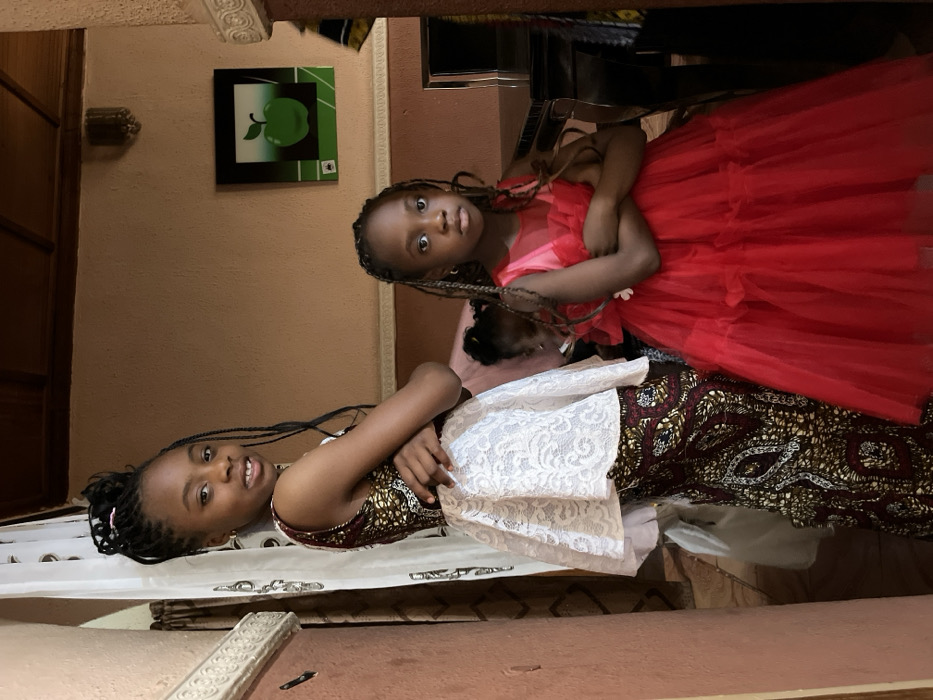 The image displays an indoor scene featuring three Black children. Two girls are positioned prominently in the foreground, both with arms crossed. The taller girl on the left, with dark braided hair styled upwards and some braids falling, wears a sleeveless top combining a dark, patterned fabric with a white lace peplum overlay, and a matching patterned skirt. She faces the camera with a slight smile. The shorter girl on the right, also with dark braided hair down to her shoulders, is dressed in a bright red sleeveless, layered tulle dress. She looks directly at the camera with a neutral expression. In the blurred mid-ground, a third, smaller child's head and upper body are partially visible behind the red-dressed girl, facing away. The background consists of light brown walls, ornate white architectural trim, and a white patterned curtain on the left. On the right wall, a framed picture of a green apple against a gradient background is mounted above a dark, reflective piece of furniture, possibly a table or console. A small wall-mounted light fixture is also visible on the upper right. The environment suggests a domestic interior or a private gathering space. While the prompt specifies the location as Jos, Nigeria, the visual content itself lacks explicit identifiers to confirm this specific city.