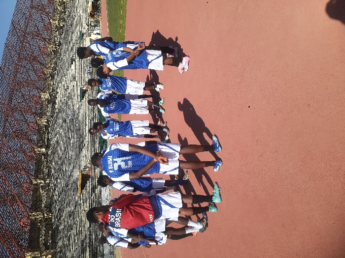 Approximately 12 young males, appearing to be football players, are gathered in a loose huddle on a reddish-brown synthetic running track within an outdoor stadium, located at New Stadium, Nigeria