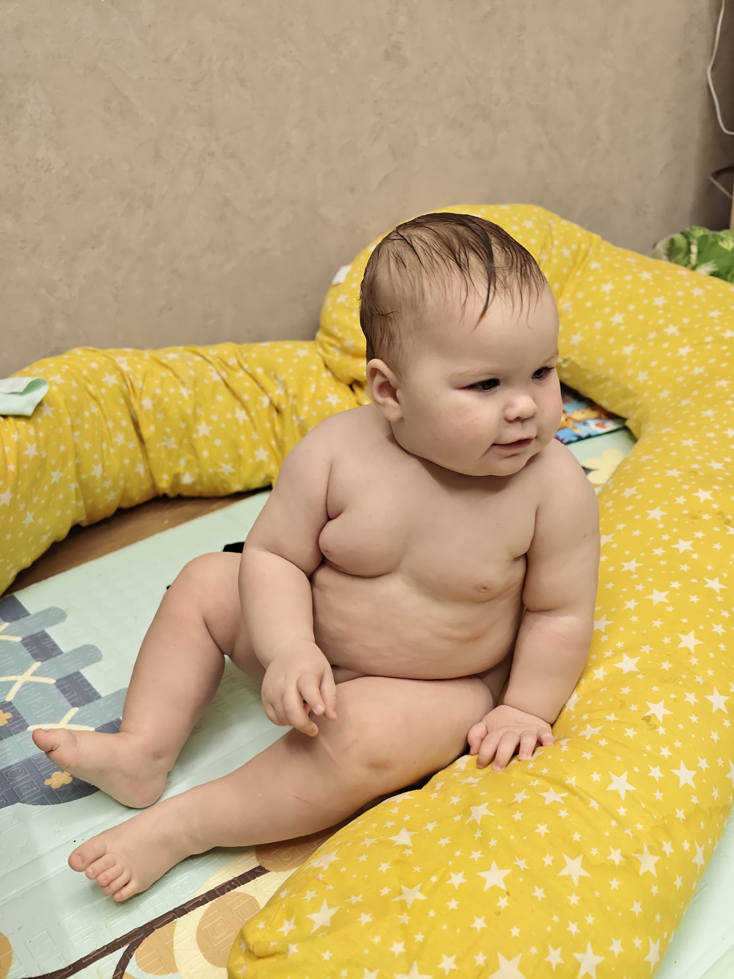 An undressed infant, identified as a baby, is depicted sitting upright on a light blue and brown patterned playmat, partially encompassed by a U-shaped yellow pillow adorned with white star patterns. The infant has light skin, wet dark hair combed forward, and is looking towards the right side of the frame. The background consists of a textured, light beige wall. A small, folded light green towel rests on the yellow pillow to the left. A white cable is visible against the wall in the upper right quadrant of the image, where a green patterned object is also partially visible. The scene is an indoor domestic environment located in Chaikovsky, Russia.