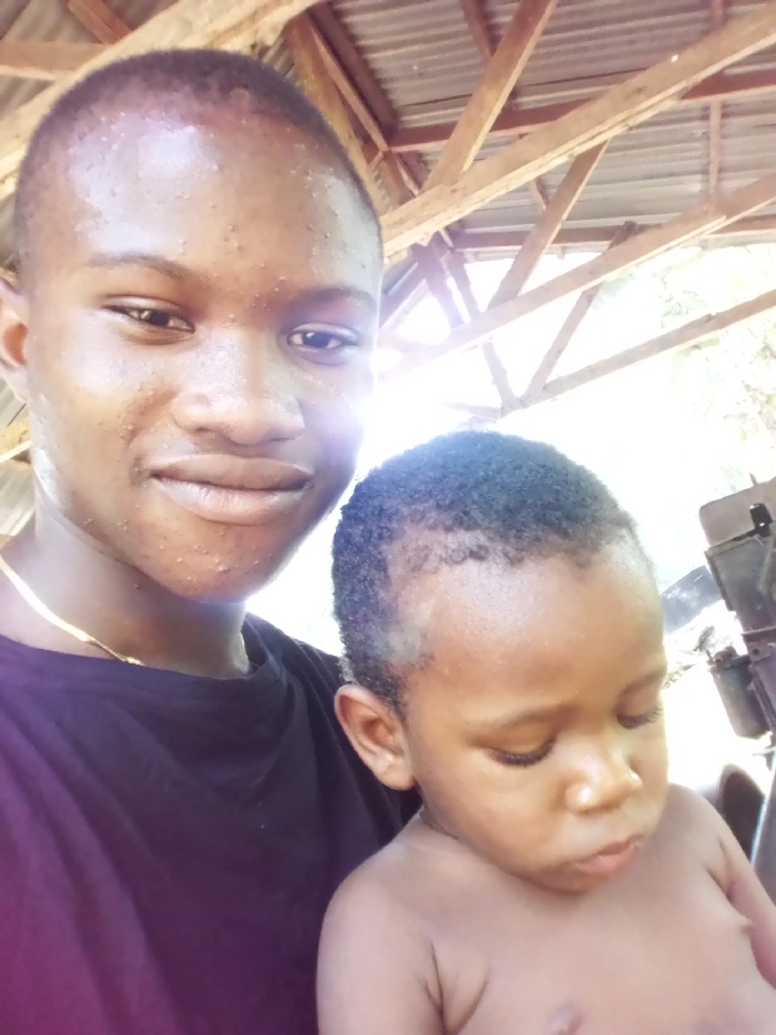 A close-up, self-taken photograph depicts two individuals, an adult male and a young child, under a semi-open structure in an unknown city and location. The adult male, positioned on the left, has dark skin, closely cropped dark hair, and visible skin irregularities on his forehead and cheeks. He wears a black crew-neck t-shirt and a thin gold-colored chain around his neck. He is looking directly at the camera with a slight, neutral smile. The child, partially visible on the right and held by or positioned near the adult male, has dark skin and short, dark, curly hair. The child's upper body appears bare. Their head is tilted downwards and to the right, with their gaze directed away from the camera and mouth slightly ajar. The background reveals a structural element featuring wooden support beams and a corrugated metal roof. A bright light source is present in the upper right, indicative of daylight. A dark, indistinct object is partially visible behind the child on the right side of the frame.