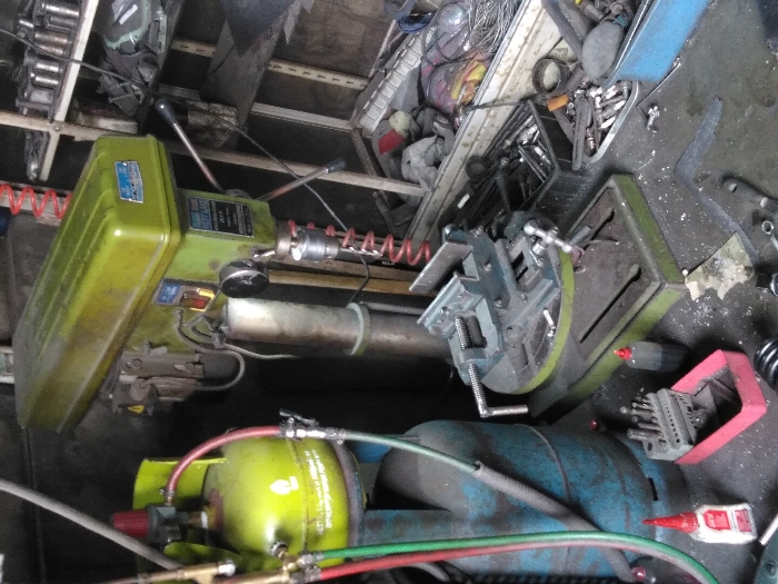 This image depicts a cluttered workshop scene in Elst, Netherlands. The central focus is a robust, olive-green pillar drill press, labeled "BEST LAKE" with model number "2121," positioned on a concrete or metal floor. A gray drill press vise is clamped onto the machine's circular table. To the left, a large blue gas cylinder stands beside a smaller, light green gas cylinder, both fitted with regulators and connected by red and green hoses, suggesting a welding or cutting setup. Behind the drill press, a metal shelving unit is visible, holding various metallic objects and parts. The floor around the equipment is strewn with metal shavings, dust, and miscellaneous tools. Specifically, in the foreground, a red plastic container holds an assortment of drill bits, a white bottle with a red cap (possibly adhesive), and a small black bottle (likely lubricant) are present. Other assorted tools, metal scraps, and containers filled with parts are visible on the floor and in the background, indicative of a working industrial environment. No individuals are present in the scene.