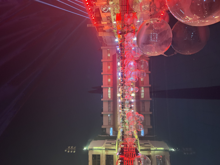 An upside-down, nighttime perspective showcases a tall building illuminated in red light. A string of clear balloons with star-shaped decorations dangles in the foreground. The building is reflected on a dark surface that looks like water. Red laser beams add a dramatic effect. The building's architecture is modern, with visible windows and multiple stories.