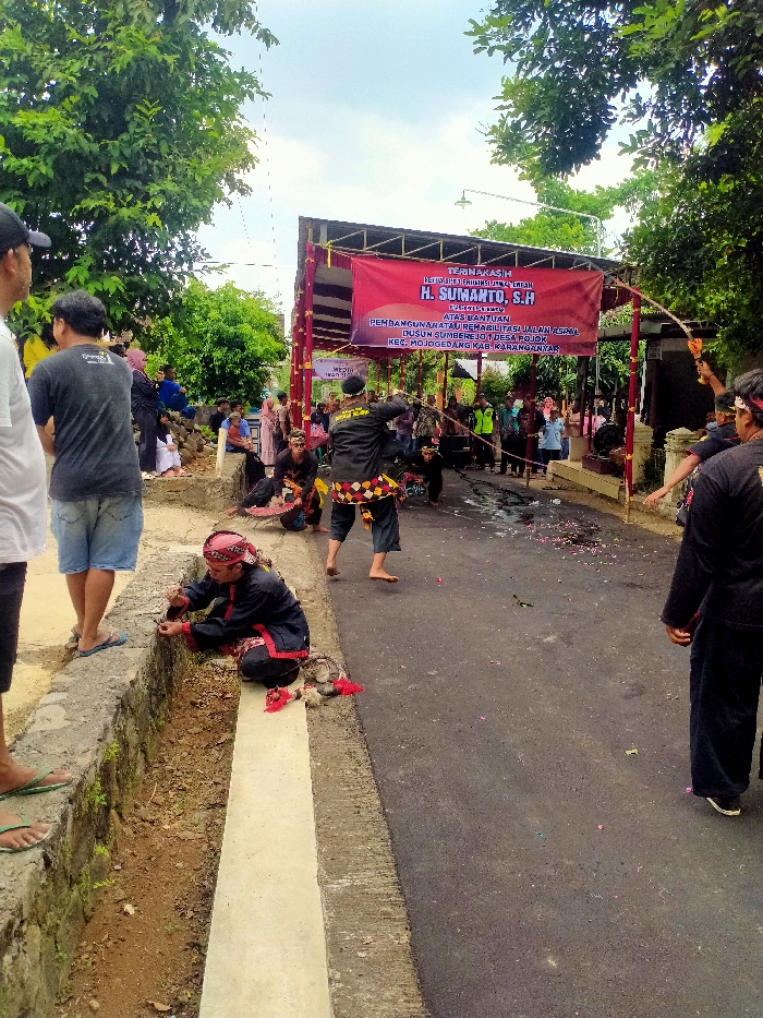 The image depicts an outdoor event on an asphalt road in Dusun Sumberejo, RT 01, Desa Pojok, Kecamatan Mojogedang, Kabupaten Karanganyar, Indonesia. A large red banner, supported by a temporary structure of wooden poles and a metal frame, spans the road. The banner text indicates gratitude to H. Sumanto, S.H., for assistance with the construction or rehabilitation of the asphalt road in the specified location. In the mid-ground, several individuals, primarily male, are engaged in what appears to be a ceremonial or martial arts performance. They wear dark, traditional-style outfits, some with red accents and headbands. One prominent figure, seen from behind, wears a black top with yellow and patterned trim, is barefoot, and holds a curved stick-like object upwards with both hands, positioned in the center of the road. Another performer is kneeling or crouching near him, also in a dark traditional outfit. To the right, another performer in similar attire is partially visible, holding a curved stick upwards. The asphalt road surface beneath the performers is scattered with small, colorful debris, possibly flower petals. On the left side of the road, a concrete-lined drainage ditch separates the road from a raised earthen bank. A man in a dark, traditional-style outfit with a red headband is kneeling beside this ditch, appearing to handle small objects on the ground near a collection of red fabric and other items. Further left, two men are partially visible from behind: one in a white t-shirt and dark cap, and another in a dark t-shirt and denim shorts, both wearing sandals, observing the scene. Numerous blurred spectators are visible in the background, standing along the sides of the road, observing the performance. Lush green trees frame the scene on both the left and right sides, and an overcast sky is visible overhead.