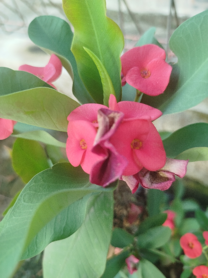 - "A close-up image depicts a *Euphorbia milii* (Crown of Thorns) plant with multiple vibrant pink to reddish-pink flowers and numerous green, oval-shaped leaves" by FM-t1qsx2, licensed under CC BY 4.0