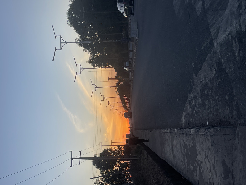 An eye-level outdoor shot depicts a street at sunset. The orange sky illuminates modern streetlights lining one side of the road. Trees flank the street, and cars are visible in the distance. A person walks along the sidewalk. The road surface and adjacent curb are dark, contrasting with the bright sky. Power lines are visible in the lower left corner. The image is taken at an oblique angle, emphasizing the road's perspective.