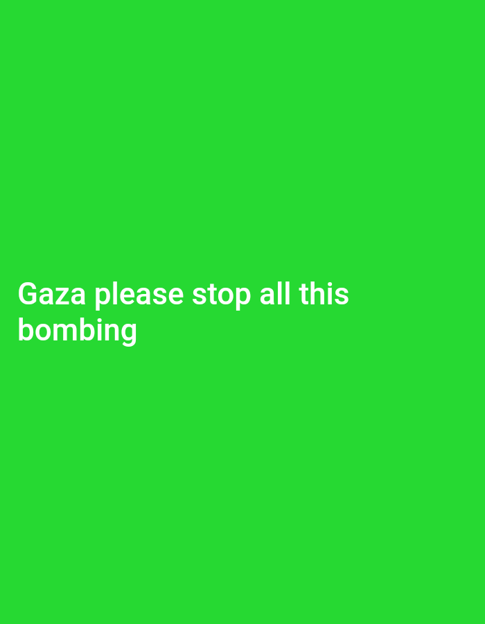 The image displays a solid, bright green background, hex code approximately #32CD32. White, sans-serif text is positioned in the lower-left quadrant. The text reads: "Gaza please stop all this bombing". No other subjects, objects, or environmental features are present. The scene is a digital display of text against a monochromatic background. The location is the city of Unknown, Unknown.