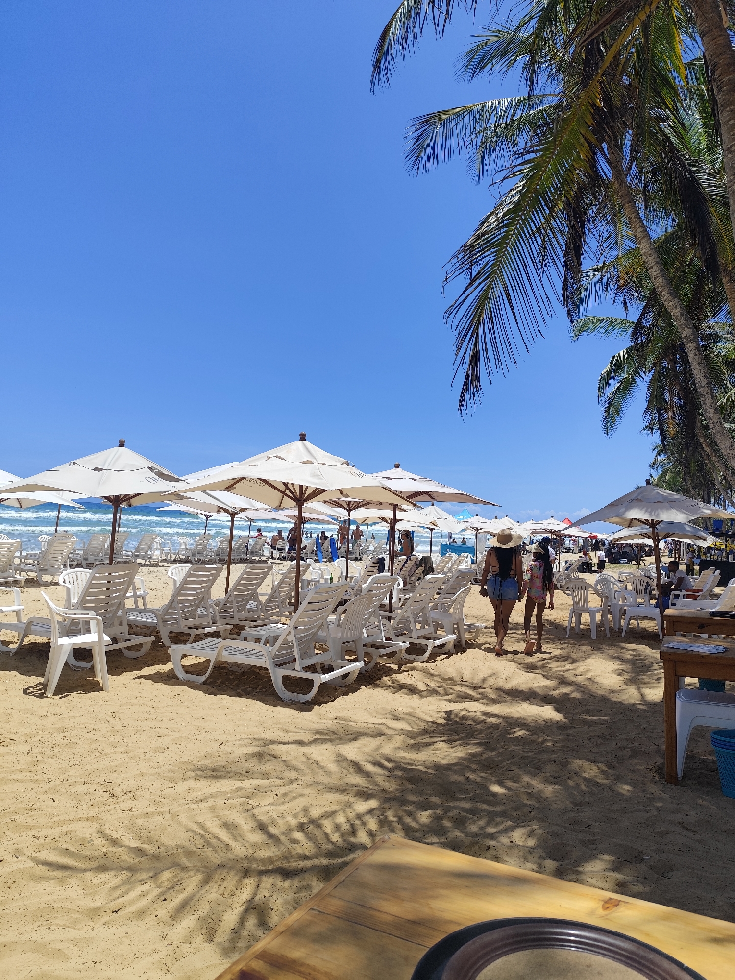 The image depicts a sunny beach scene at El Conchal, Venezuela. The foreground features a wooden table, partially visible, suggesting a restaurant or bar setting. The midground showcases rows of white plastic lounge chairs and beach umbrellas spread across the sandy beach. Two figures, a woman wearing a hat and a young girl, are walking between the rows of beach furniture. In the background, the ocean is visible under a clear blue sky. Palm trees line the edge of the beach on the right side of the image. Shadows from the palm trees are cast across the sand in the foreground. Several people are visible in the background, some near the shoreline.