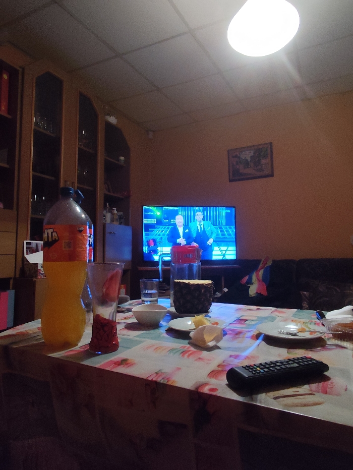 An indoor scene in Samokov, Bulgaria, depicts a room illuminated by a bright overhead ceiling light, casting a warm glow on the surroundings. The walls are painted a light orange-peach color, with a framed picture hanging on the far wall. The ceiling features white, square acoustic tiles. To the left, a tall wooden display cabinet with glass doors houses various items, including glassware and what appear to be books. A small, light-blue refrigerator is positioned to the right of the cabinet. In the center, a flat-screen television displays two men in suits against a blue, digitally enhanced background, suggesting a news program or talk show. In the foreground, a rectangular table is covered with a multi-colored tablecloth featuring abstract patterns. Various items are arranged on the table: a large plastic bottle of Fanta orange soda, a tall glass containing red fruit pieces (possibly strawberries or cherries), a small empty white bowl, a clear drinking glass filled with water, and a cut pineapple showing its yellow flesh. Adjacent to the pineapple is a small white plate holding pineapple chunks and a white, curved fragment, resembling an eggshell or fruit peel. A second white plate with a fork and some food residue is partially visible. A black remote control with numerous buttons rests on the table's edge. Behind the pineapple and glasses, a red-lidded clear jug is also present. A dark, possibly leather, sofa or armchair is partially visible in the background to the right, behind the table. The scene suggests a casual evening setting, likely after a meal, with television viewing in progress. No individuals are physically present in the frame.