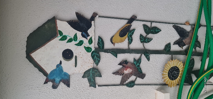 - "A colorful metal wall decoration features a birdhouse on the left with a blue bird below and two black birds on top" by FM-PD02y1, licensed under CC BY 4.0