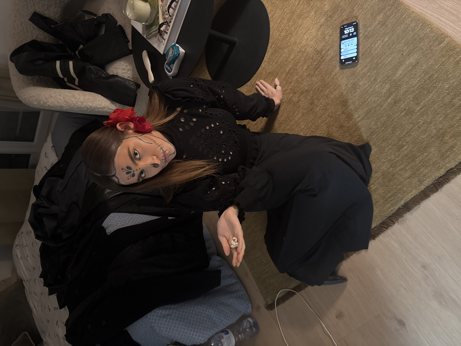An indoor photograph depicts a female subject seated on a light brown rug. The specific address or landmark within Paris, France, is not visually identifiable from the image content. The subject is an adult female with long brown hair, featuring facial makeup resembling a sugar skull or calavera, with black outlines defining the eye sockets, nose, and mouth, and decorative patterns on the forehead. A red flower is positioned behind her right ear. She wears a long-sleeved black top with a high neckline and eyelet cut-out patterns on the bodice and sleeves, paired with a long black skirt. Her left hand is extended, holding a small cluster of white, irregularly shaped objects, resembling decorative miniature skulls. Her right hand rests flat on the rug. She is looking directly at the camera. In the background to the left, a bed is visible with a patterned duvet and a dark fitted sheet, covered with a disorganized pile of black garments. A clear plastic water bottle stands on the floor nearby. To the right of the subject, a cream-colored armchair has a black leather jacket draped over it. Adjacent to the armchair is a round black side table holding a lit white pillar candle in a clear glass holder, a pair of dark-framed glasses resting on an open book or magazine, a white cylindrical object, and a blue and white contact lens case. A smartphone, displaying the time 10:13, lies face-up on the rug in the foreground to the right of the subject. The room is dimly lit, suggesting an evening or low-light setting.