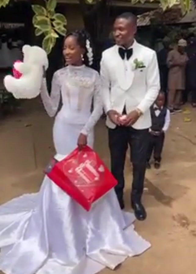 A newly married couple stands outdoors on what appears to be a reddish-brown dirt ground. The bride is holding a white teddy bear with a pink heart, and a red gift bag. She wears a long-sleeved, high-necked white wedding dress with lace detail and a long train. The groom, in a white tuxedo jacket with black pants and a bow tie, stands next to her. An individual is handing the groom something small from off-screen to the right. In the background, there are people dressed in formal wear and traditional outfits, suggesting a wedding celebration. Lush green foliage overhangs the scene, providing partial shade. A child in a tuxedo can also be seen in the background.