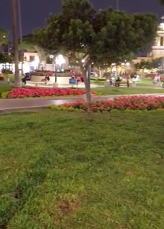 nighttime scene in a park with a church and gazebo visible in the background. There are patches of green grass and flower beds with red flowers. People are sitting on benches in the park. Street lights illuminate the area. The sky is dark. The camera moves slightly to the right during the video.