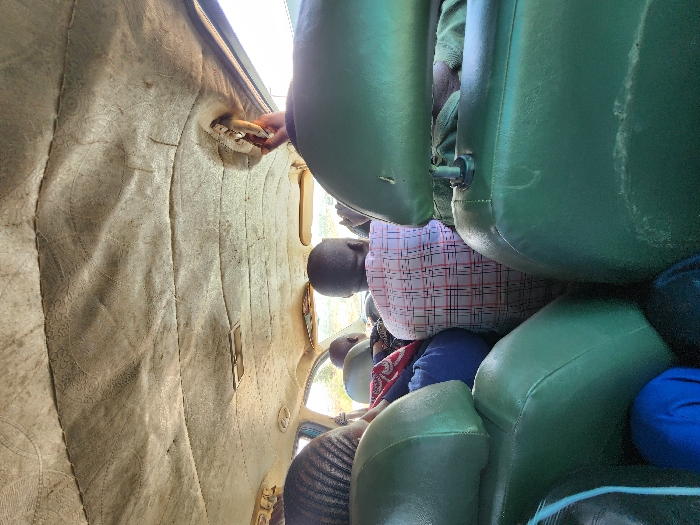 The image displays the interior of a crowded passenger vehicle, viewed from a rear passenger seat looking forward