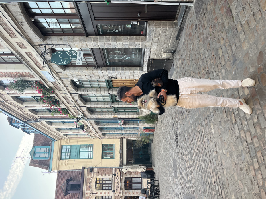 An outdoor, eye-level full shot depicts a male subject holding a Pomeranian dog on a cobblestone street in Vieux-Lille, France, specifically Rue des Vieux Murs