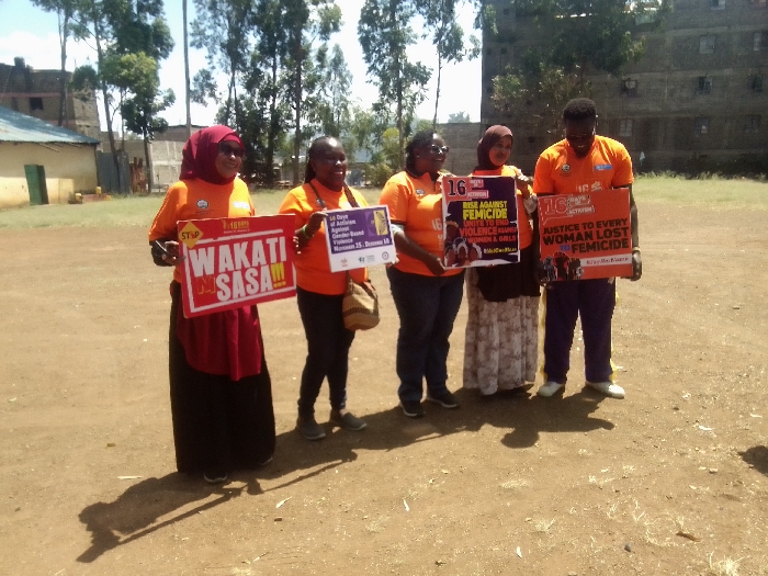 Five people stand in a row holding signs. All wear orange shirts. The signs display messages against femicide, emphasizing "16 Days of Activism Against Gender-Based Violence" and advocating for justice for women lost to femicide. One sign reads "Wakati ni sasa," urging action. The group stands on a dirt ground, with trees and a building visible in the background. The setting appears to be an outdoor area, possibly a park or public space.