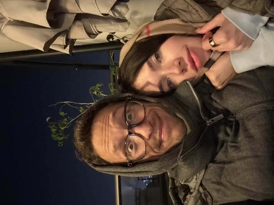 A man and a woman pose closely for a selfie outdoors at night. The man, with glasses and a gray hooded jacket, is in the foreground, smiling. The woman is behind him, wearing a beige scarf/hood and a light blue sweater. Part of a patio umbrella and some small tree branches are visible in the background. A cityscape is dimly visible below.