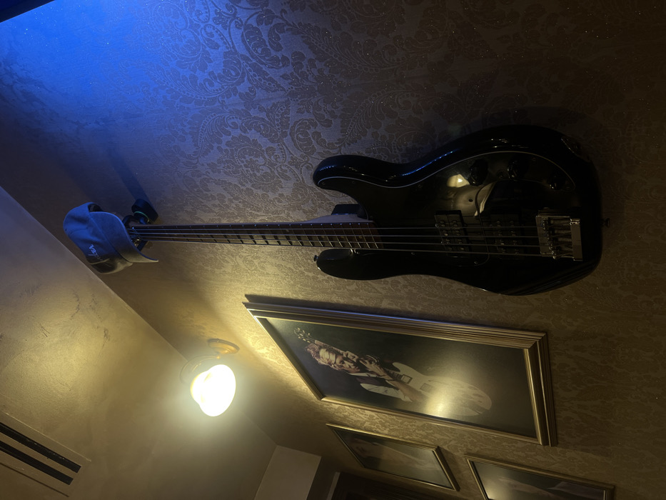 The scene depicts the interior of a commercial establishment in Budva, Montenegro. The walls are covered with textured wallpaper featuring a repeating gold-beige damask pattern that exhibits a subtle shimmer. A warm yellow light emanates from a wall-mounted sconce with a frosted dome shade on the left, while a cool blue ambient light illuminates the right side of the wall. An overhead ventilation grille is visible on the ceiling at the top-left. A black, glossy four-string electric bass guitar is prominently displayed, hanging vertically on the right side of the wall. A light gray baseball cap, embroidered with the word "Fender," is perched on the headstock of the bass guitar. To the left of the guitar, a large, gold-framed portrait features a man with long hair and a beard, identifiable as musician Willie Nelson, playing an electric guitar. Two additional framed artworks, partially visible, are positioned above and below the Willie Nelson portrait. No individuals, direct actions, or interactions are depicted within the visible frame.