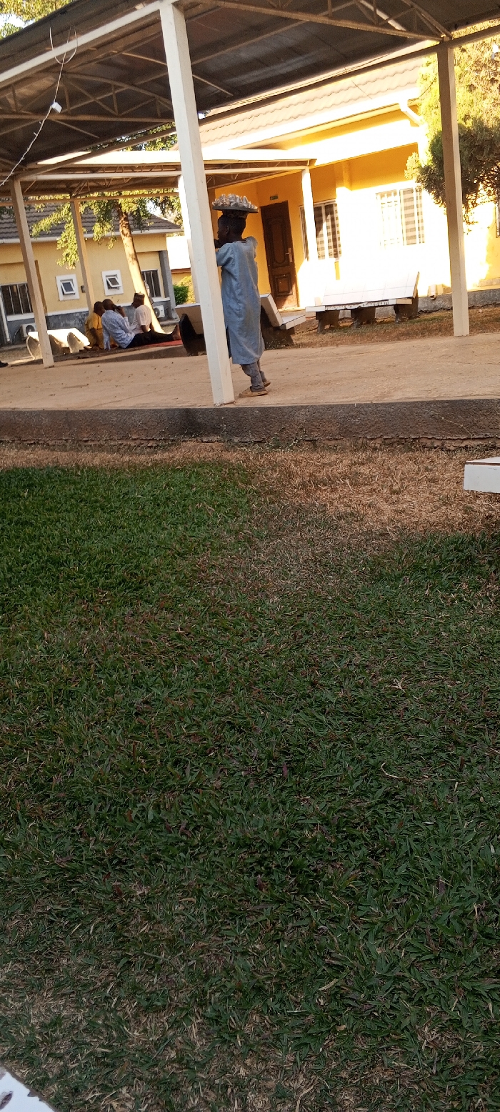 This image depicts an outdoor scene in Tudun Nupawa, Nigeria. The foreground consists of a grassy area featuring both green and dry brown patches, demarcated by a dark concrete curb. Beyond the curb, a light-colored concrete pathway is covered by a canopy structure composed of a metal frame and a corrugated roof, supported by white square columns. String lights are affixed to the canopy's metal framework. Under the canopy, a person wearing a light blue tunic and light brown shoes is observed walking towards the right. This individual balances a flat, circular tray laden with numerous small white objects on their head. Further into the background, beneath the same canopy, three other individuals are seated on the concrete ground. One person is dressed in a yellow garment, another in a light-colored shirt with legs extended, and a third wears a dark hat. They appear to be resting or engaging in interaction. Behind the covered pathway, two light yellow-painted buildings with brown roofs are visible. These structures feature brown doors and windows equipped with horizontal blinds. White benches or low platforms are positioned against the facades of these buildings. The scene is illuminated by natural daylight, highlighting architectural features and creating soft shadows.