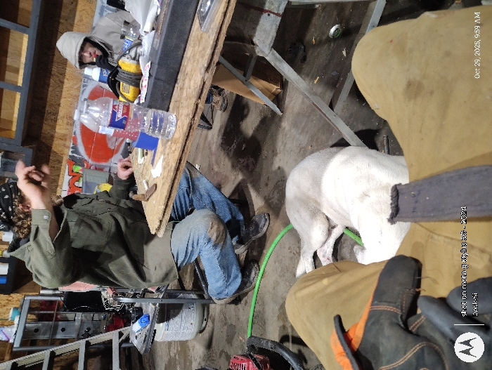 This image depicts an indoor scene within a cluttered workshop or garage environment, located in Ozark, United States, captured at 9:59 AM on October 29, 2025. In the immediate foreground, a person's legs, clad in tan work pants, are visible, with a black and orange work glove on the left hand, indicating the perspective of the individual taking the photograph. A white dog is lying on the concrete floor directly in front of this person. In the mid-ground, a male subject with curly hair and a dark bandana is positioned to the left, squatting or kneeling next to a metal-framed stool. He wears an olive green long-sleeve shirt and blue jeans, with dirt marks on his knees, and is actively gesturing with his right hand, pointed upwards and to the right. To his right, a makeshift workbench constructed from a wooden plank supported by metal legs holds various items. These include a clear plastic bottle of Ozarka brand water, a smaller blue bottle, a knife with a dark handle, a yellow angle grinder, and a black tool case. In the background, another male subject is seated behind the workbench, wearing a light-colored hooded sweatshirt with the hood up. He appears to be looking down at the table, with his left hand near his mouth, possibly holding an object. The walls of the space are covered with light-colored wood paneling, featuring red and white graffiti, including the letters "O-Z," behind the seated individual. A framed opening is visible above the graffiti. To the far left, a metal shelving unit containing miscellaneous objects and a gray propane tank are visible, along with a partial view of a metal stepladder. A green hose or electrical cord is also present on the concrete floor.