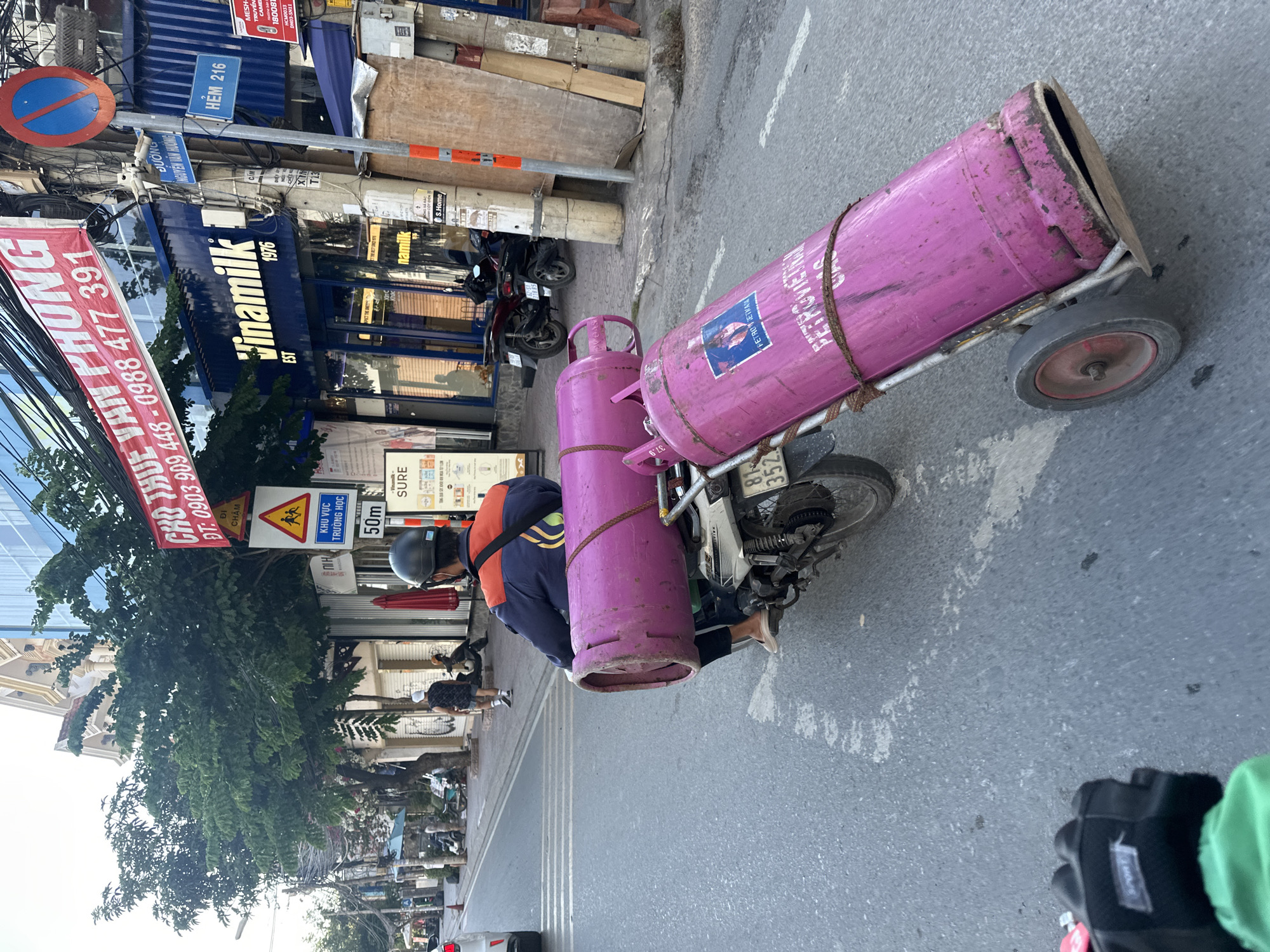 An outdoor, eye-level photograph depicts a person transporting gas cylinders by motorbike on a paved road in Thủ Đức City, Vietnam. The central figure, viewed from behind, wears a dark helmet and a navy blue and orange uniform jacket, operating a white motorbike with a partially visible license plate ending in "352." Two large, magenta-colored gas cylinders are secured for transport. One cylinder rests horizontally on the motorbike's rear rack, and a second cylinder is mounted horizontally on a two-wheeled dolly trailing directly behind the motorbike. Both cylinders display "PETROVIETNAM GAS" branding. The scene is set on ĐƯỜNG NGUYỄN VĂN HƯỜNG, indicated by a blue street sign on the right. Adjacent to this is a blue sign for "HẺM 216" (Alley 216) and a red circular "No Stopping" sign. Overhead, a red banner advertises "CHO THUÊ VĂN PHÒNG" (Office For Rent) with phone numbers. Further along the sidewalk, a yellow triangular warning sign for a school zone ("KHU VỰC TRƯỜNG HỌC") with a "50m" indicator is visible. A "Vinamilk EST 1976" store with a blue facade is prominent on the right side of the street, alongside other commercial buildings and parked motorbikes. Utility poles with extensive wiring run along the sidewalk. A pedestrian in a white hat walks away from the camera on the sidewalk. The asphalt road surface shows white paint markings, including a crosswalk. The image is captured from behind another person, whose gloved hand and green sleeve are visible in the lower left foreground. The lighting suggests daytime conditions.