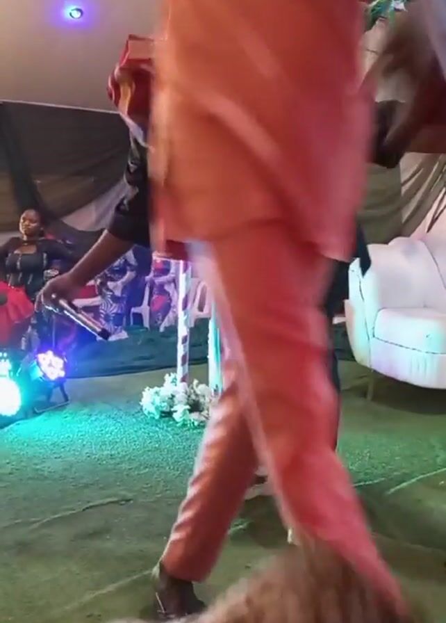 The video depicts a person performing a dance in what appears to be an event hall. The individual is wearing a dark, casual outfit with a red cap and white sneakers. They are holding a microphone and dancing with energy. Behind them are decorations and other people, including a group of seated guests. The lighting is festive, with spotlights illuminating the dance floor. The video is handheld.
