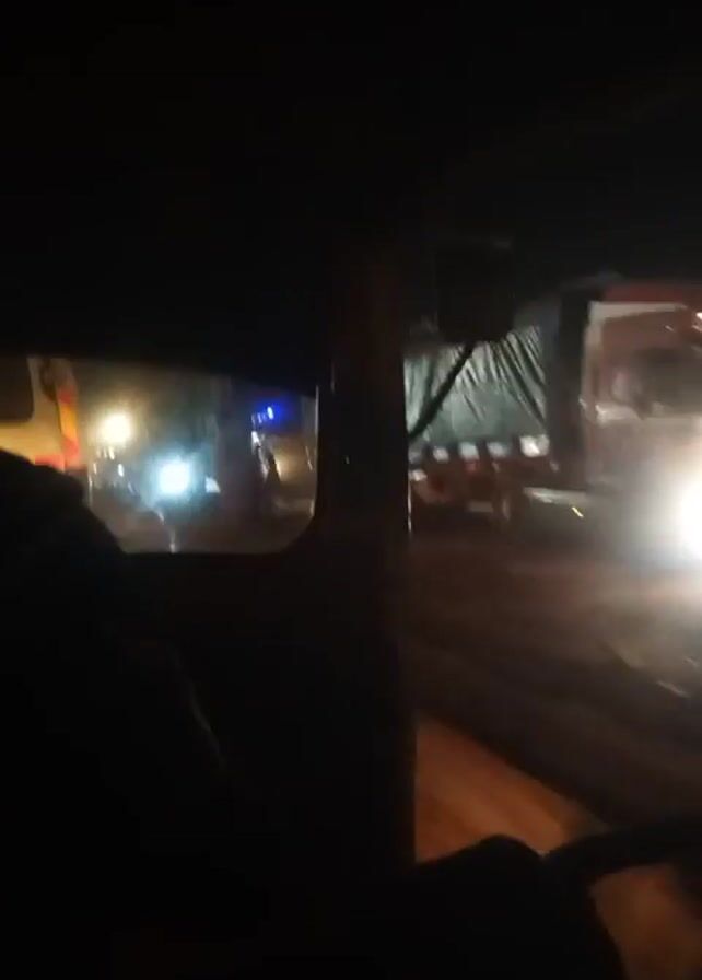 The video is shot from inside a moving vehicle at night. The camera is positioned behind the driver, whose hands are visible on the steering wheel. Outside, there are other vehicles with bright headlights. Some of the vehicles are large trucks. The environment is dark, and the road surface appears to be rough. The overall atmosphere suggests travel or commuting under challenging nighttime conditions with heavy traffic.