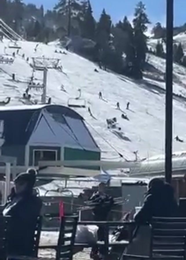 busy ski slope on a sunny day. People are skiing and snowboarding down the hill, and a ski lift is visible, carrying people up the slope. In the foreground, there is a patio area with tables and chairs. Several people are sitting at the tables, enjoying the view of the ski slope. There are also a few trees and buildings visible in the background. The sky is clear and blue. The overall impression is of a pleasant winter day at a ski resort.